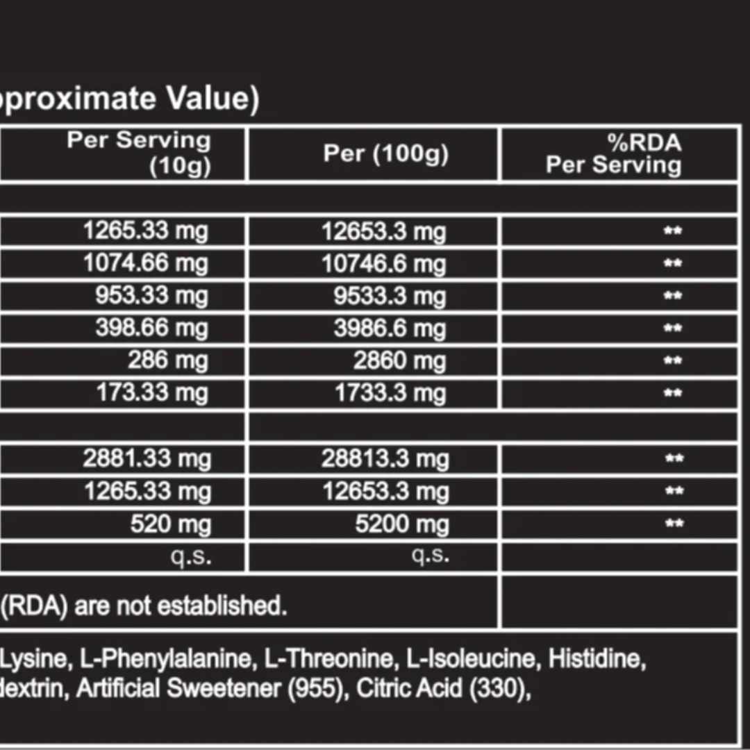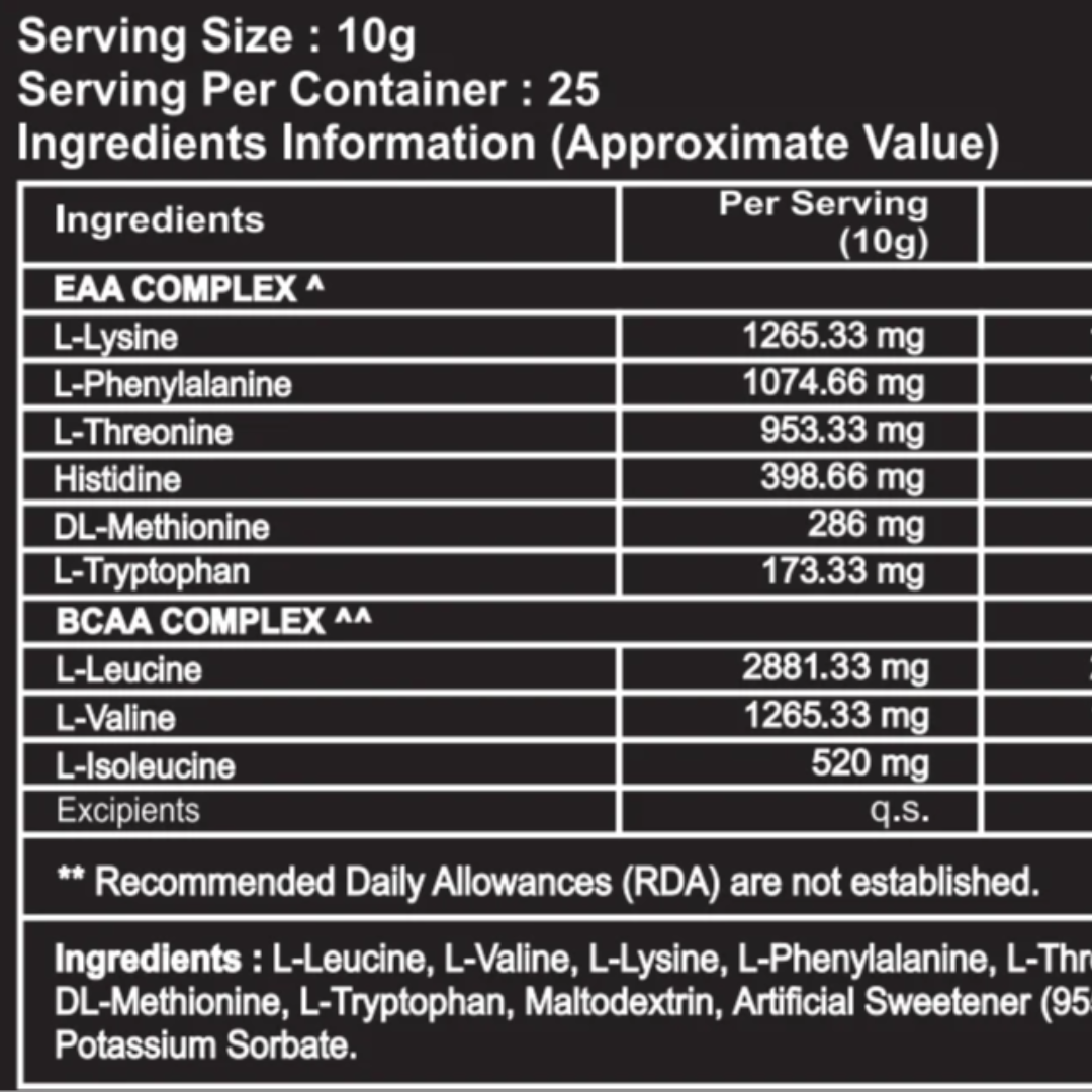 This superior blend is the amalgamation of 9 Essential Amino Acids (Leucine, Isoleucine, valine, Lysine, Phenylalanine, Threonine, Histidine, Methionine, and Tryptophan). EAA facilitates muscle building and recovery and delivers faster absorption for optimal results. EAA promotes muscle protein synthesis, boosts physical performance, and is monumental in various physiological functions.