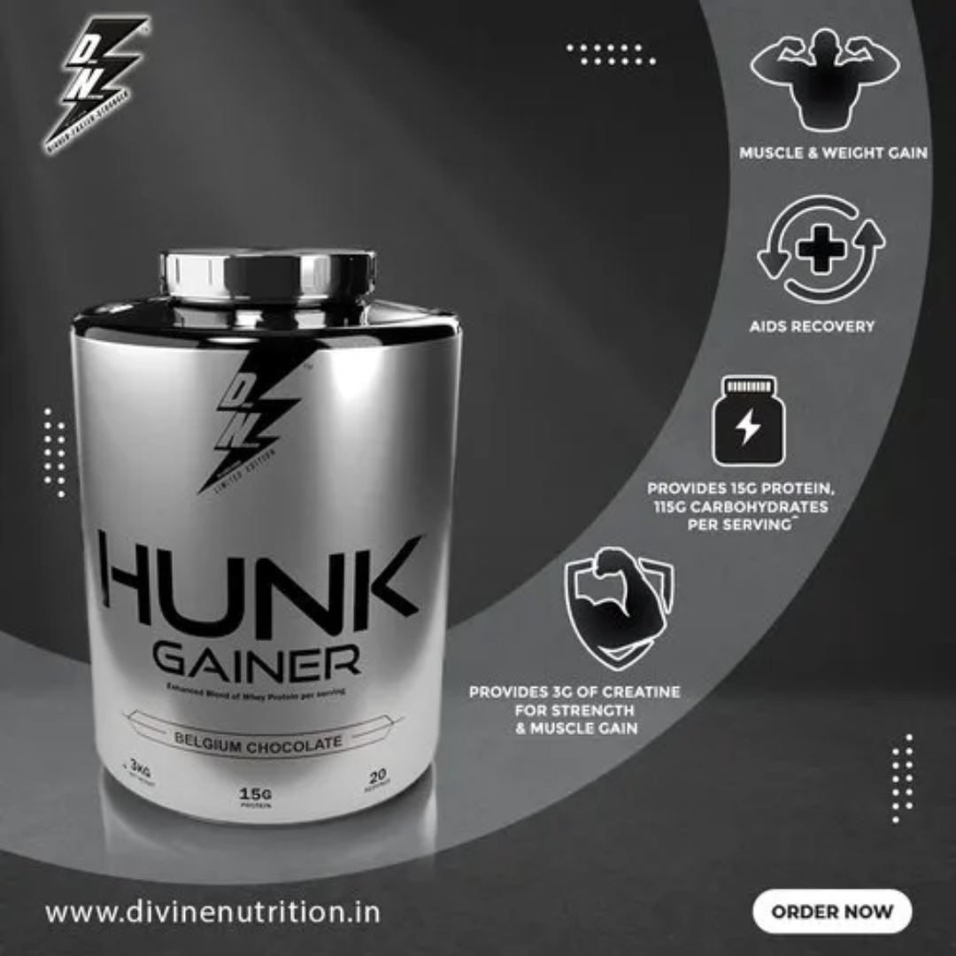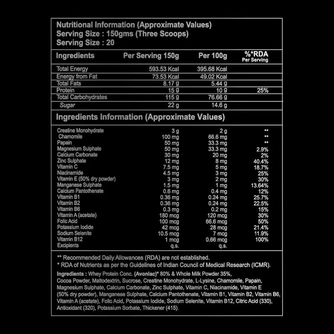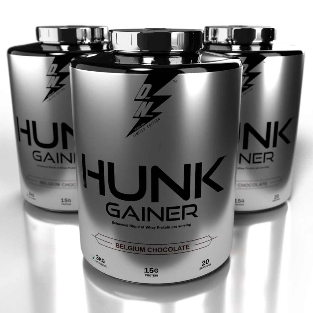 A high calorie, premium blend of whey protein concentrates and whey protein isolate – Hunk Gainer, helps you increase your overall calorie intake and achieve the surplus required to gain muscle mass. It contains 15g of protein, 115g of carbohydrates, and 3g of creatine monohydrate which improves exercise performance, builds muscle and amplifies strength. It is enriched with vitamins, minerals and digestive enzymes which increase absorption and aid digestion to prevent bloating.
