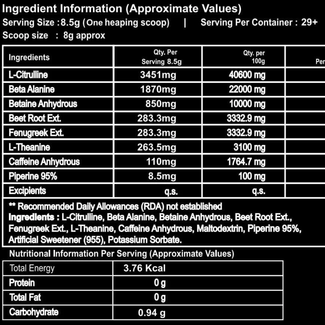 A scientifically formulated pre-workout supplement that boosts your overall performance for optimal results – Pre-Workout is packed with ingredients that help you push your limits. It is an amalgamation of L-citrulline that promotes pump, beta-alanine that improves endurance, betaine anhydrous that perfects overall performance, L-theanine that improves concentration, and caffeine to keep you up, alert, and energized.